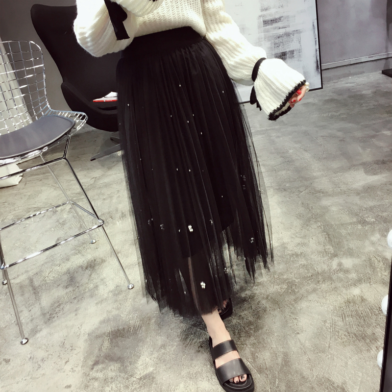 【EC】2016秋装新品 气质修身网纱珍珠松紧腰中长款半身裙 女J04